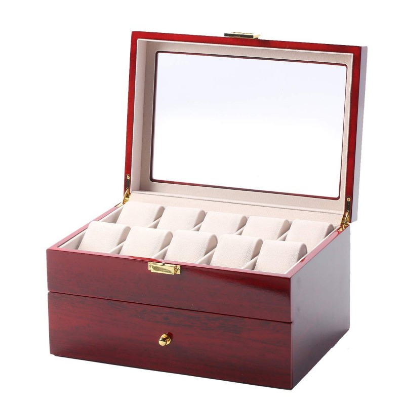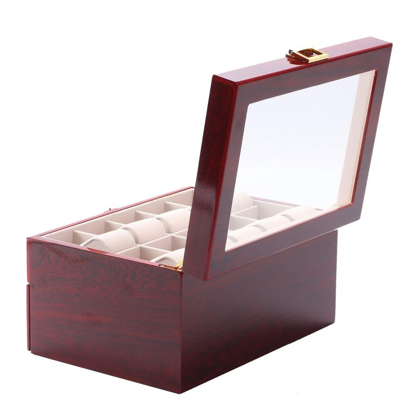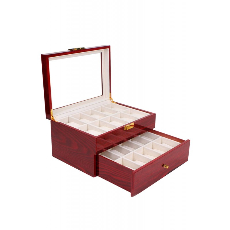 Cutie deosebita din lemn lacuit pentru 20 de ceasuri - Design special, cu ceasurile dispuse pe doua nivele. Partea superioara este acoperita cu un capac cu geam din sticla iar partea inferioara reprezinta un sertar.