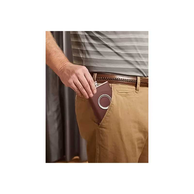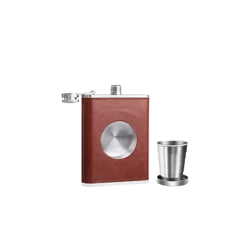 Set plosca cu pahar pliabil ShotFlask , capacitate 250 ml, inox si piele ecologica, maro roscat, usor de transportat, Doty®️