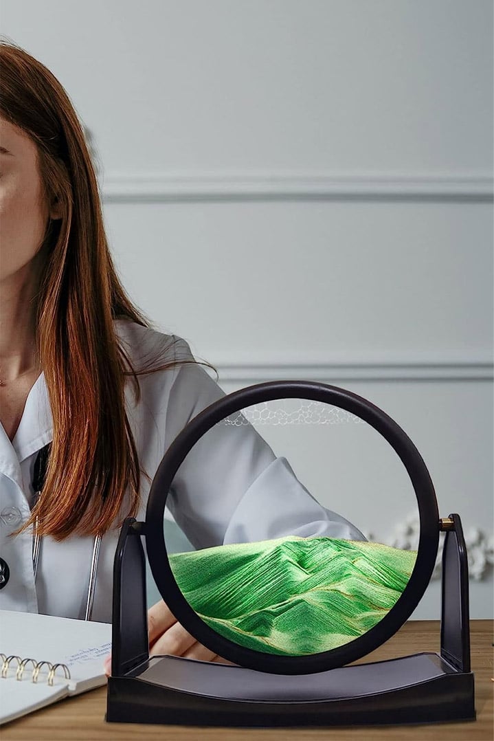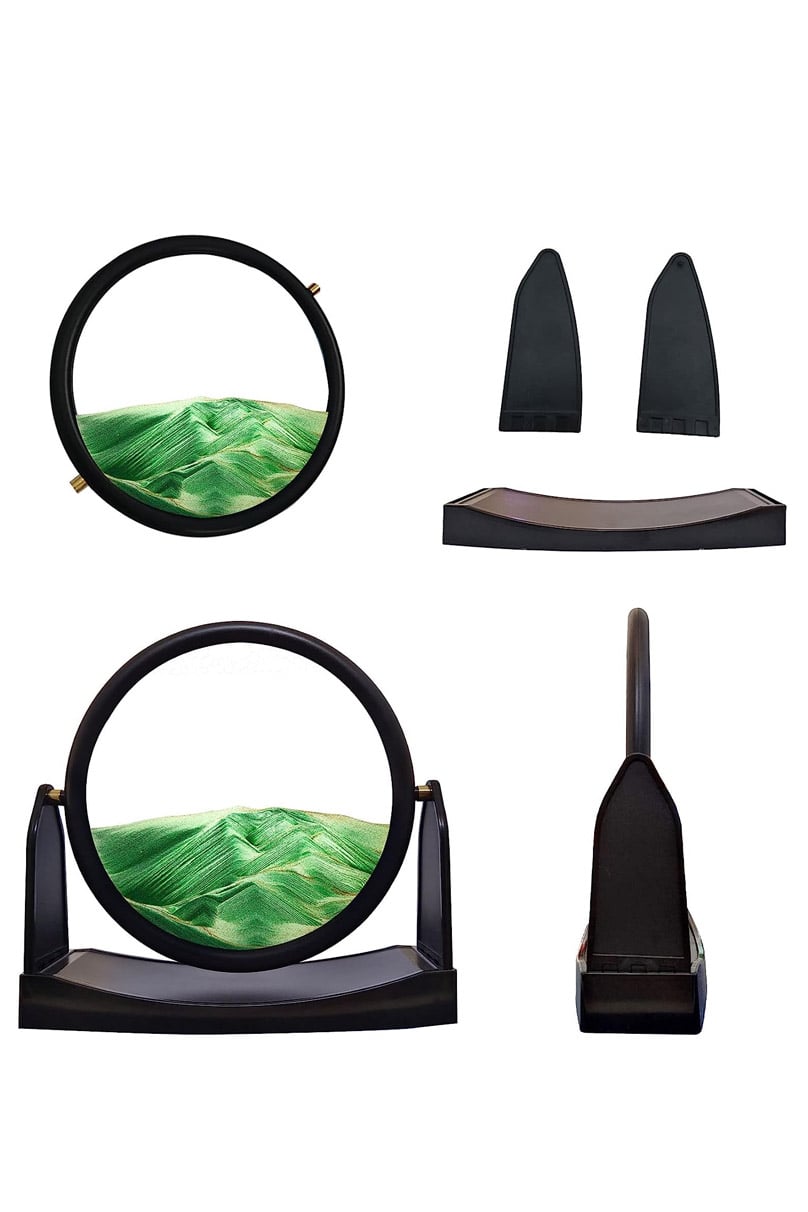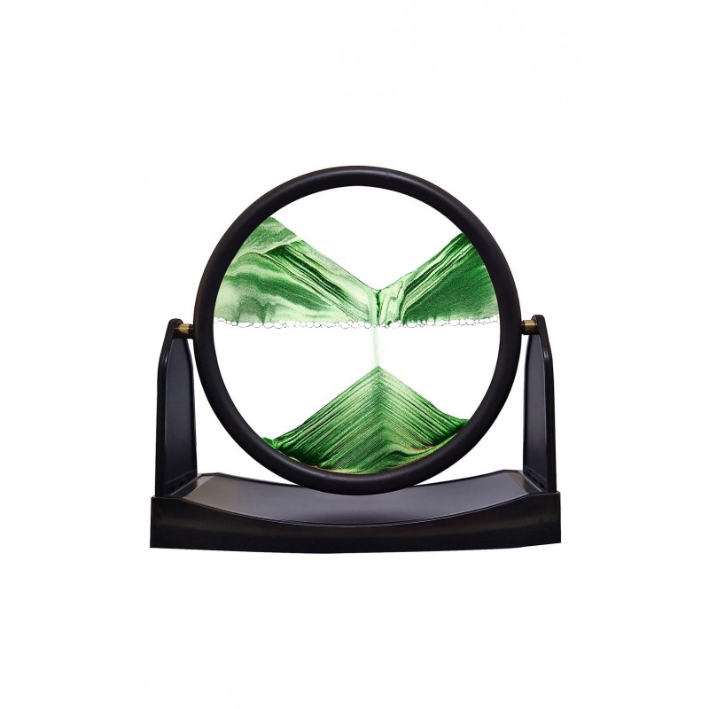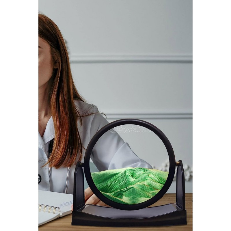 Obiect decorativ pentru birou ShowSand, tip tablou cu nisip miscator, 3D, clepsidra rotativa, antistres, forma rotunda, negru/verde, 22.5x21.5 cm, Doty®️